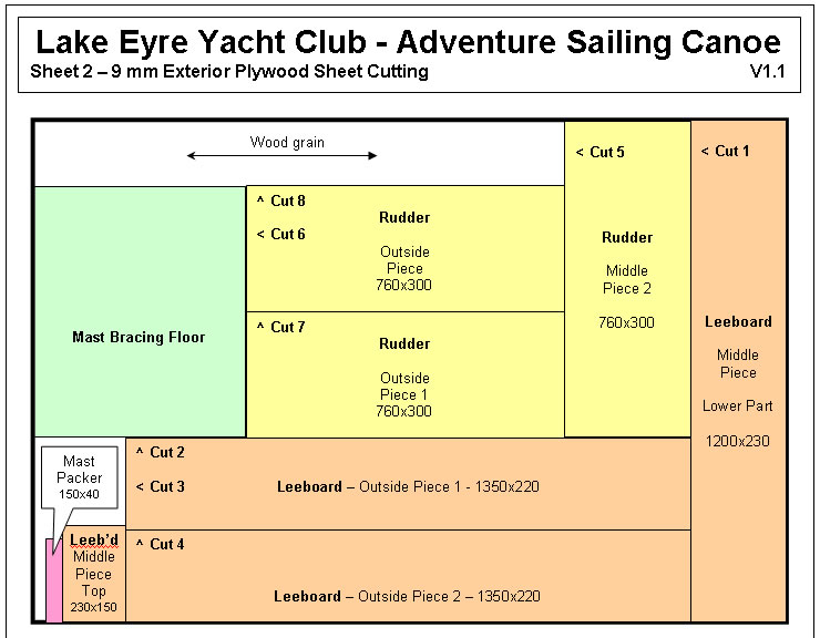 All woodwork is made from one 1.8m x 1.2m sheet of 9.6mm exterior quality ply as per Sheet 2. This material is suitable for situations where the timber is not constantly immersed. Marine ply is exterior ply with mould inhibitors added to prevent rot due to constant immersion and is much more expensive than exterior ply. Three laminations are used for each item with the middle lamination having its grain across the width, rather than the length, to improve strength. Another option would be to use 12.5mm ply and only have two, rather than three, laminations. This would reduce the amount of epoxy used by half as epoxy IS expensive.