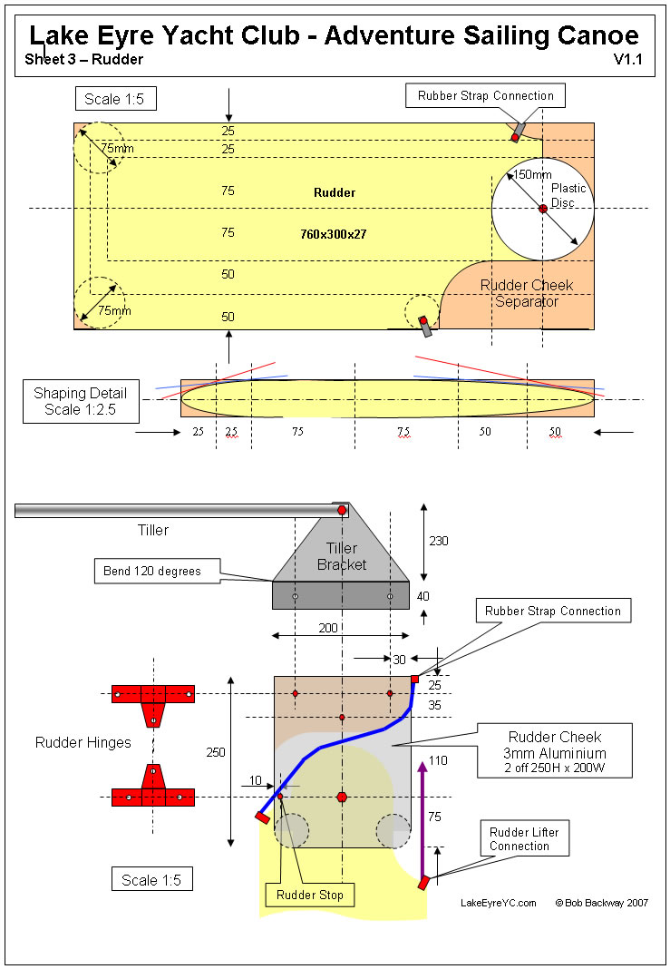 Rudder Mounting Bracket A Canadian fiberglass canoe is designed using compound curves so fitting a rudder to the rear of the canoe is difficult. The solution to the most difficult problem of this project is to start with a cardboard template of rough dimensions as per Sheet 2b. Looking at the image of the bracket should be able to make a similar bracket for your canoe. The template needs to reach the outboard mounting bracket bolts as they will hold the rudder bracket to the boat. Note: It is important that the rudder hinge is vertical, or better still has its top mount more aft. If the hinge has its top mount closer to the boat the rudder will tend to fall "in" and at right angles to the boat when left free - thus stalling it. Trim with scissors to fit curves or if the template is too small measure out from edge and make notes on the template nearby. The template does not need the 25mm tab that fits under the coaming of the canoe which is used to bolt it on but don't forget to add it when marking out the aluminium. I usually make a note on the template to remind me. To aid construction the bracket is made as two sides which overlap behind the rudder hinge. The two sides can be bent to the same curve as the canoe in soft 3mm aluminium. As the sides are roughly triangular by placing the hypotenuse together you can make both out of a sheet about 400x350mm.
