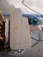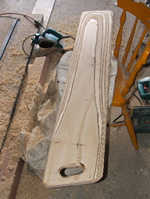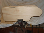 24 hours after glueing refer to the leeboard and rudder drawings and mark them out using ruler and compass. The drawings show the jigsaw/band saw cutting required. Double check all dimensions before cutting and be sure to save the cut off from the rudder that is used as the rudder cheek separator.