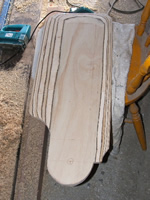 Cut all pieces for the rudder and leeboard and laminate them using two part epoxy glue and as many clamps as you can lay your hands on. When laminating the leeboard align all pieces along one long side. The outer pieces will be 10mm narrower on the other side it being the rear, more tapered, edge. Note that the middle lamination is made from two pieces due to sheet size. Mark the shorter piece as the top of the leeboard.