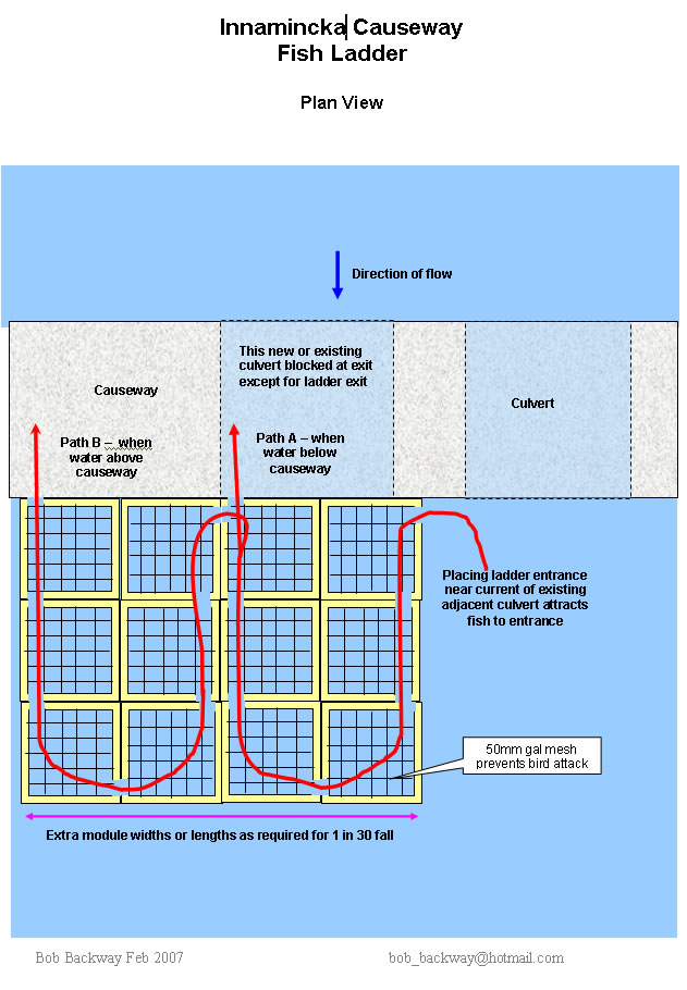 The Lake Eyre Yacht Club is interested in preserving the environment of the Lake Eyre Basin. In 2004 discussions were initiated with the South Australian Department of Transport on the possibility of installing fish ladders on the Lake's tributaries where road culverts impede the upstream migration of desert fish during floods. Desert fish can travel vast distances in shallow streams but lack the ability to swim against strong currents or jump a low waterfall - they live in flat country! At present the watercourses affected are the Stuart and Margaret Creeks where crossed by the Oodnadatta Track and Coopers Creek at the Innamincka Causeway. Ladder installation (steel design) on the Oodnadatta Track causeways commenced mid 2006 and completed in 2007.